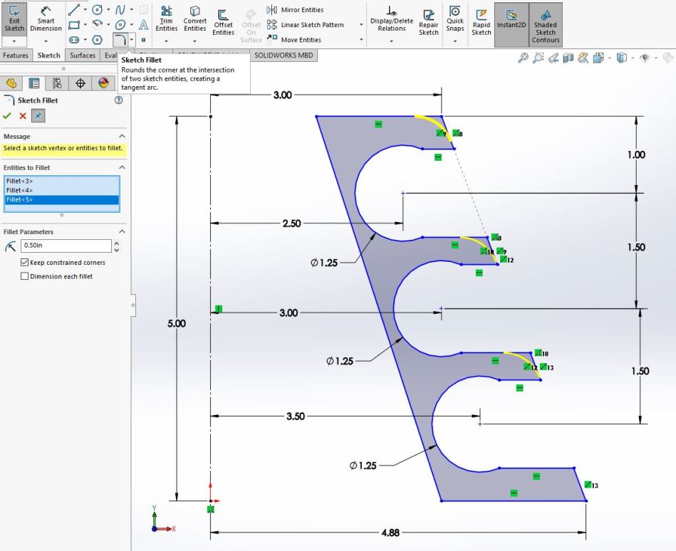 Our first fillets, the three corners of the outside of our cat toy which we added a 0.5 inch radius.