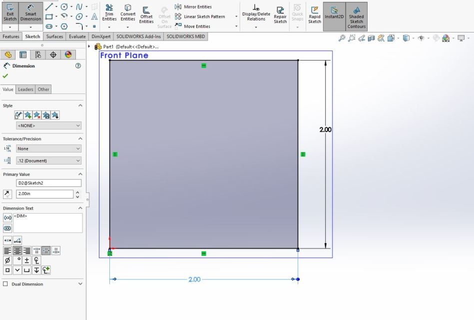 Now we are in our smart dimension tool options (on left) where we can set the dimensions of our rectangle to be 2 inches x 2 inches (50mm x 50mm)
