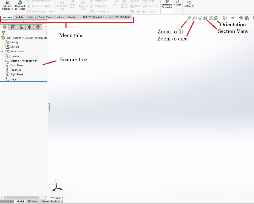 Our feature tree is where our part lives. It tells us the order of operations and how they were applied. The top of the feature tree is what was done first, and the bottom is what was done last. You can drag the order of operations around, but it will change the way the part is made so you may end up breaking the part. You cannot drag a operation past a previous operation if it depends on that operation. In short, if I cut a hole into a part and the hole is based on dimensions of that part or is drawn on the surface of that part I cannot put it before the creation of the part because the face I drew it on or the dimensions I related it to do not exist. Note my feature tree is empty because I haven’t created anything, but if you go back to our previous classes you’ll see how the feature tree is populated by whatever action you perform.
