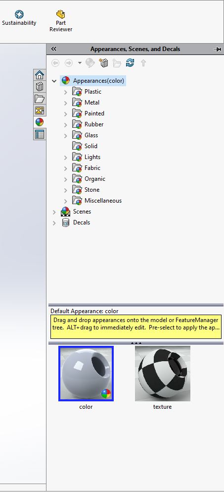We already covered the appearance menu in depth, but here it is shown below. It’s located on the right side of the screen and the tab for it is a ball with a lot of different colors. Like sketchup it’s organized into folders, but unlike sketchup you get quite a selection.
