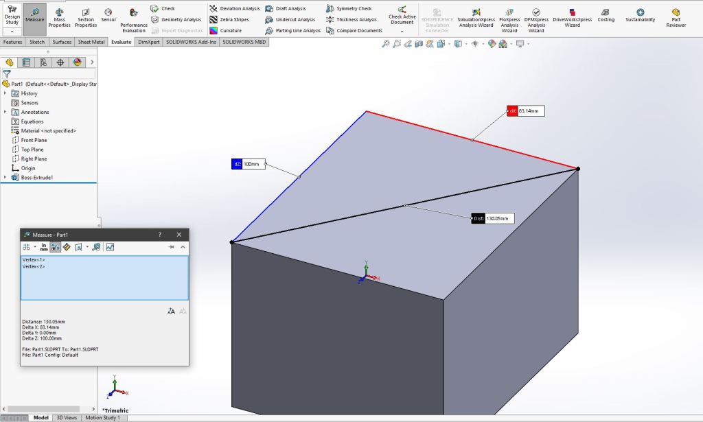 One thing we never covered, but can be useful is the evaluate tab (shown below). In particular the measure tool, which lets you click a face, line, or point, and get the distance between that and a second line,face, or point. It will return that information in x axis, y axis, z axis, and 3 dimensionally.