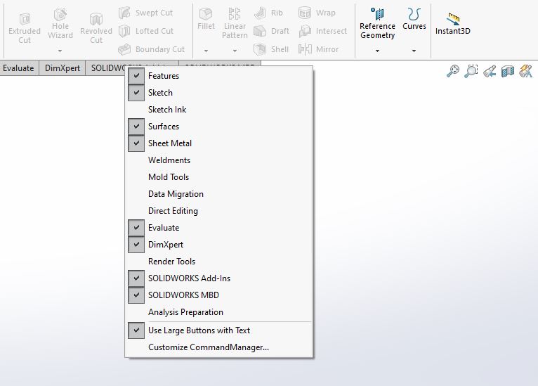 Now there are some hidden tabs that don’t get shown by default! If you right click the tabs you’ll see some options for tabs you don’t have visible. Such as the sheet metal tab (which I have turned on in the image above). Here’s the other options you have (below). Mold tools are for if you’re creating something that is going to be a model (for castings). Sheet metal should be obvious, but gives you tools to create parts using sheet metal operations (bends and the such).