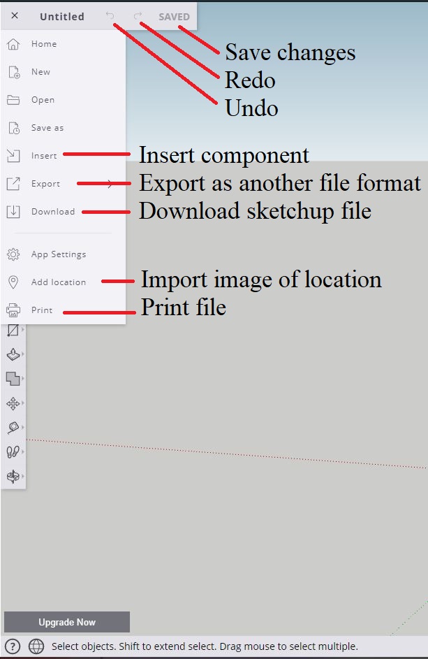 If you click the three lines at the top left of the screen you’ll get a little dropdown menu. (shown below). Home takes you to the main screen. New creates a new part. Open lets you open a part. Save as gives you the option of saving the file with a different name. Insert let’s you add other parts into the part you’re working on. Export gives you the option of exporting your file as (among other things) an .stl part so you can 3D print it, use it other ways, or share it with friends. Download lets you save it locally to your computer as a sketchup file. Lastly you have options for app settings (we won’t get into those, but they should be self explanatory), the ability to add a location (literally add a location from a map and import it as an image). Print lets you print your design (regular print, not 3D print, which is still pretty cool if you ask me). See below for the image.