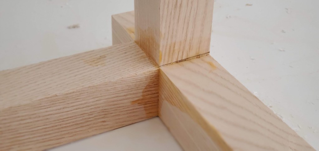 This is my first real woodworking project and I’ve learned a lot along the way about what to do and how to do it. Not all of my joints came out as tight as I wanted, but I did manage to get a few that I’m really proud of. For example here’s one that I did that came out nearly perfect. Ignore the glue stains and the pen mark, those will get standed away before I start assembling the rest, but the joint fits well together and creates minimal seam. It has me excited about the rest of the project.