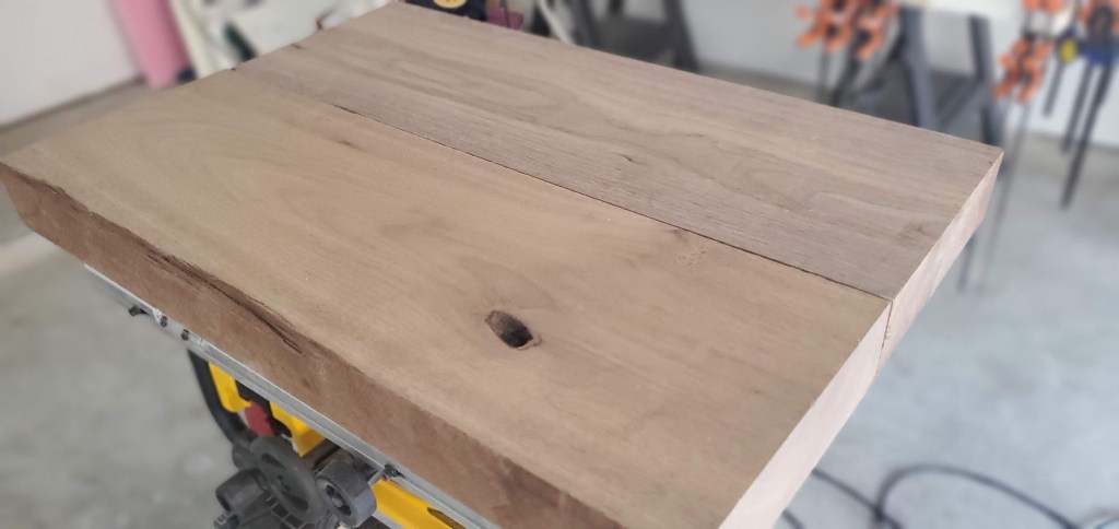 The joint is a 3 way half lap joint (technically one of the cuts is a cross lap, but details). Since everything was dry I stressed the joints by putting my body weight on it and the frame is solid. I’m really looking forward to get the rest assembled. The frame is ash, the sides are hard white maple, and the top is black walnut. It’s going to be a thick top at ~2 inches, so pretty substantial. Below is the top, it’s two pieces I’ve cut to size, now I just need to glue them together and go through all the finishing stuff.