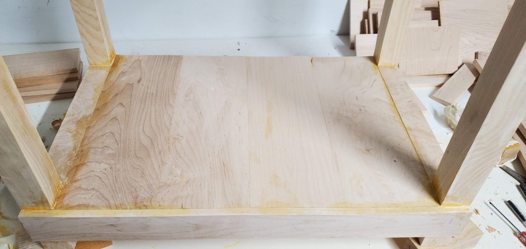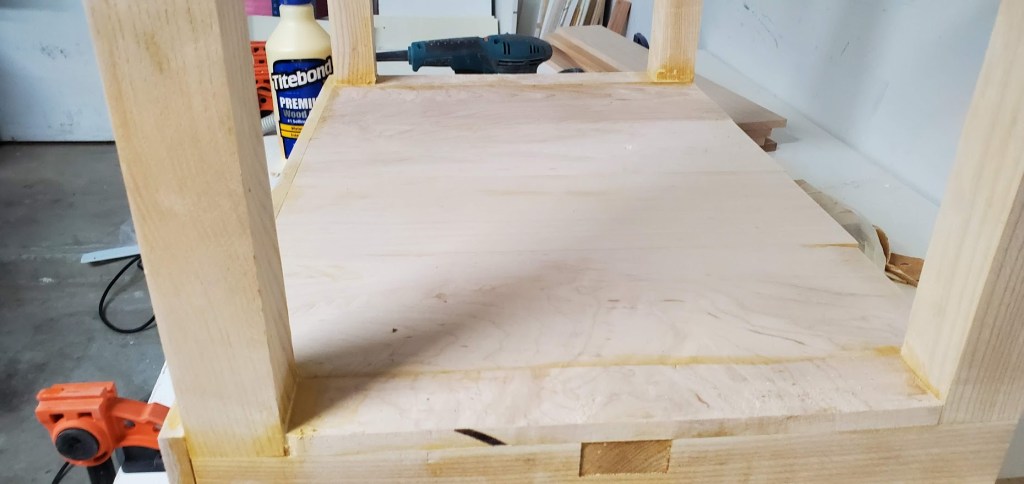 Well I glued most of the bottom in place (here), but I had two pieces that I wanted to glue in separately to make sure I had a tight fit to the frame so a couple of days ago I glued those pieces in place. That means the bottom for this project is completely glued into place now. The photo below shows what that looks like. I’ll still need to go and sand all the glue spots off and clean things up a little. I admit it, it looks like a mess at the moment, but some sanding should clear a lot of that up.