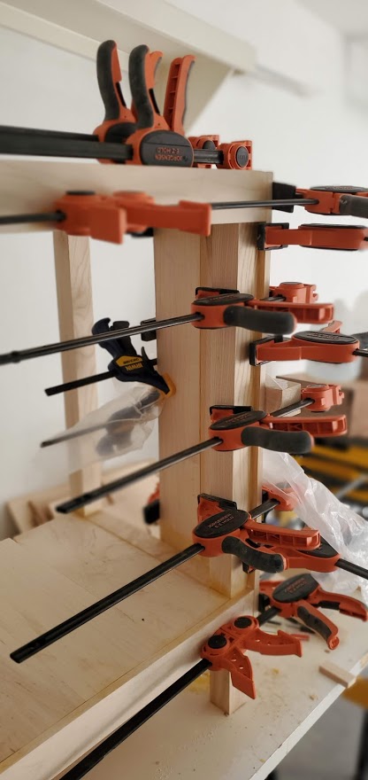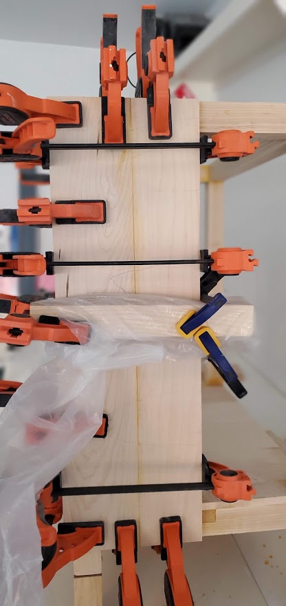 So that’s where I left the project as of yesterday. Today my plan is to do one of two things, I’m either going to finish gluing together the rest of the side, or I will start on the other side. I’m starting from the front and working my way to the back so if I mess anything up in the back, it won’t be seen. I am leaning towards starting the other side today since I feel like that would be easier because I would just flip the clamping arrangement I’m using now, whereas doing the back I may need a different arrangement for the clamps. Doing it that way I may even be able to glue the back half on both sides at the same time (if the number of clamps allows it).