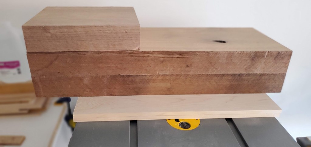 The photo above is from the inside of the vanity cabinet, there is a slight overhang that I made to accommodate the doors, you’ll see when we get to that step why that was added, but basically it’s to cover the end grain since that’s a standard woodworking thing (having the endgrain showing is ugly to some I guess, I don’t mind it, but I wanted to be “professional” whatever that means). Anyway I’ve glued on two of the four boards for the sides, I want to take my time with this, but I also ran out of clamps. I’m probably over clamping it, but I would rather over clamp than under clamp.