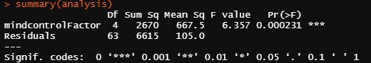 Notice how we have an F -value (follow mind control factor row over to the F-value column), which we covered what that means (here), but Rstudio was nice enough to do two things, the first is give us the probability of a type 2 error, the Pr(>F) column, which is 0.000231 or 0.023%. The second is the *** again, we’re lazy we don’t want to think if it’s significant we want the computer to tell us. The *** significance means the value is close to zero (Signif. codes at the bottom of the screenshot). Sometimes we will even refer to our significance as one, two, or three star significance because of this convention used in software. So we have significance! That will make our mad scientist boss happy and now we’re done… right?