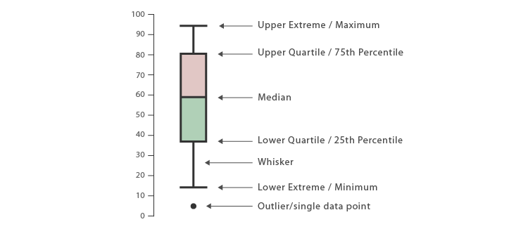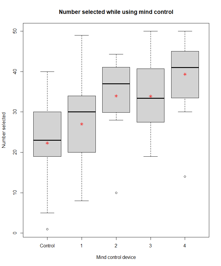 The above is a boxplot showing our data. If you’re not familiar with a box plot, the box itself is the first and third quartiles, the whiskers (the dotted lines) represent the maximums in our data. The dots, those are outliers or data that fall outside of 2 standard deviations from the mean (calculated from the dataset for that group, control, 1, 2, etc). A quartile is just a quarter of the data, so nothing crazy going on there. The line is the median value or the middle value, the red asterisk (*) is our mean or the average value. If you prefer a figure to help you understand, the figure below has all the anatomy of a box plot labeled (note: I added in the mean manually, that’s not normally shown on the boxplot). Already it LOOKS like something may be working with the 2nd and 4th mind control device, but is it significant?