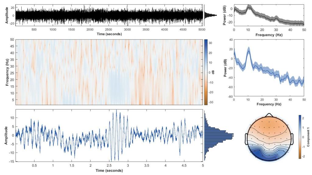 Not the same participant, but similar independent component (read more). There are several oddball additions I’ve made to this, like the topoplot (the bottom right circle, which is actually a head from the top view nose is the triangle looking thing up top and ears are the sides). I added a label so I knew which component I’m looking at (we have 60 so keeping track is important). I rotated the dB label on the color bar for the spectrogram (middle colorful plot on the left) and you’ll notice my scale is now in the actual range it should be and not 3000 or more. The light blue and black shading on the PSD plots (top right and middle right) are the 95% confidence intervals for the data and everything is now in seconds with larger font and bolded labels.