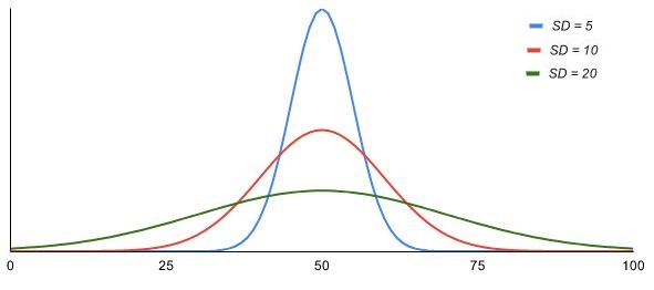 That’s sort of the thing that gets skipped over a lot that doesn’t make sense until you look into why it’s even a thing. Variance is needed because it makes math easier, but standard deviation is easier for you and me to understand, which is why we are stuck with both! Luckily the symbols for them remind us of their relationship, because everyone is lazy and no one wants to have to memorize formulas so we do little things like that to make it easy to keep track of what’s related to what (hint for people studying math/statistics/physics/etc.). One last thing, we mentioned this above, but below is a visual for how the normal distribution changes as the variance (or standard deviation) is increased. You’ll remember that your y axis is from 0 to 1 (the curve never actually reaches to 1 since the area under the curve sums to 1 or 100%) and is the chance your value will end up within a certain range, as your variance increases, your chances of getting a value close to the mean (50 in the example below) start to drop pretty rapidly. This is why (in neuroengineering at least) we like our data to be very low variance if we can help it.