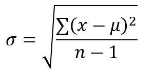 This is important because in most cases we don’t know the “actual” values for the variance and mean in our population, but if we have enough samples statistics says we can get close to those values. Now that we’ve covered that little warning, let’s just look at the formula to calculate standard deviation and then we can talk about why the math works the way it does. The equation for standard deviation ( σ ) is: