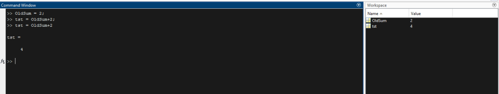 The NewSum is my variable name and I’m setting it equal to my OldSum, which is a variable that already exists and can be anything in this case, then I’m adding 2 to it. The ; at the end of my code suppresses the output in the command line. This means when I run the code the command line wont show that I ran anything, which is useful because it turns into an ugly hard to read mess, but the code will run and it will update my variables.