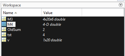 Side note, it’s impossible for us to think in 4D or higher. We just cannot do it, but we can do math in 4D and higher and sometimes it’s more computationally efficient to do so. You do need to be careful when doing that because it’s not intuitive and can lead to some issues. I try to work in 3D or lower, but on occasion 4D or higher will come into play for the work I do. It doesn’t happen often, but when it does I am extra cautions about checking the math and that I get the expected result from the operations I run. Normally when I need a 4D matrix it’s to take the mean across the 4th dimension and thankfully that isn’t hard to check since I can take the mean of the first entry across the fourth dimension and make sure that the value matches what I would expect to find. Below is the workspace showing a 3D matrix called M3 (4x20x6) and a 4D matrix called M4 (4x20x6x10). Notice that MATLAB only lists the 4D as 4-D