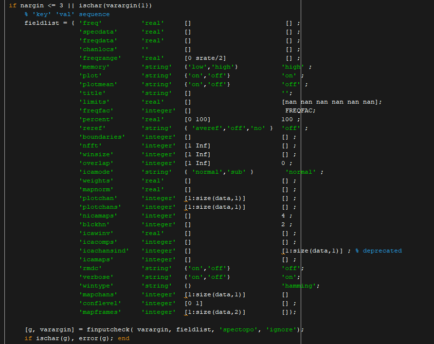In my code g is a structure full of all the inputs the user specified (or my defaults), so I would call frequency by g.freq and not freq since that variable is stored inside this structure g. This is useful when you’re debugging because you can group all the variables together and with a single line of code you can verify that you have the correct types of inputs. It even lets the user specify certain strings as on, off, etc. which is helpful because it’s much more intuitive than having to specify a number to turn something on or off (by using a 1 or 0 for example).
