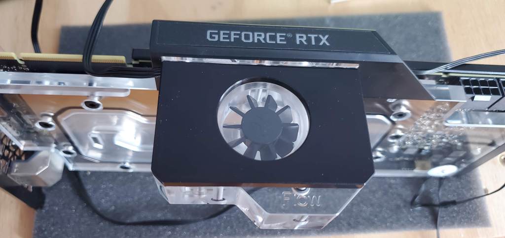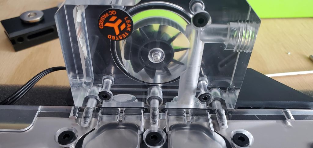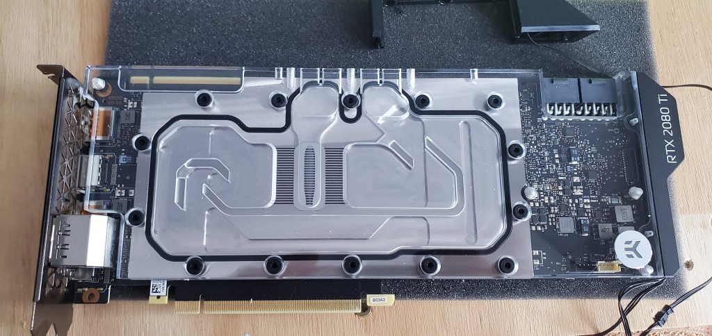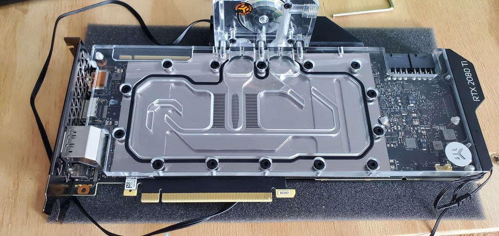 Since the radiators are now in I could add the GPU (graphics card) back to the motherboard. Previously I said you couldn’t see the flow of the liquid in the loop, this is correct, but to help diagnose problems they do make flow indicators (to help determine if the pump stops working for whatever reason). The one I got is an addon to the graphics card and it installs with two screws so nothing too exciting, but here’s some photos of how that went.