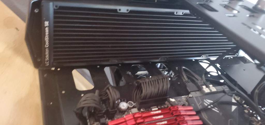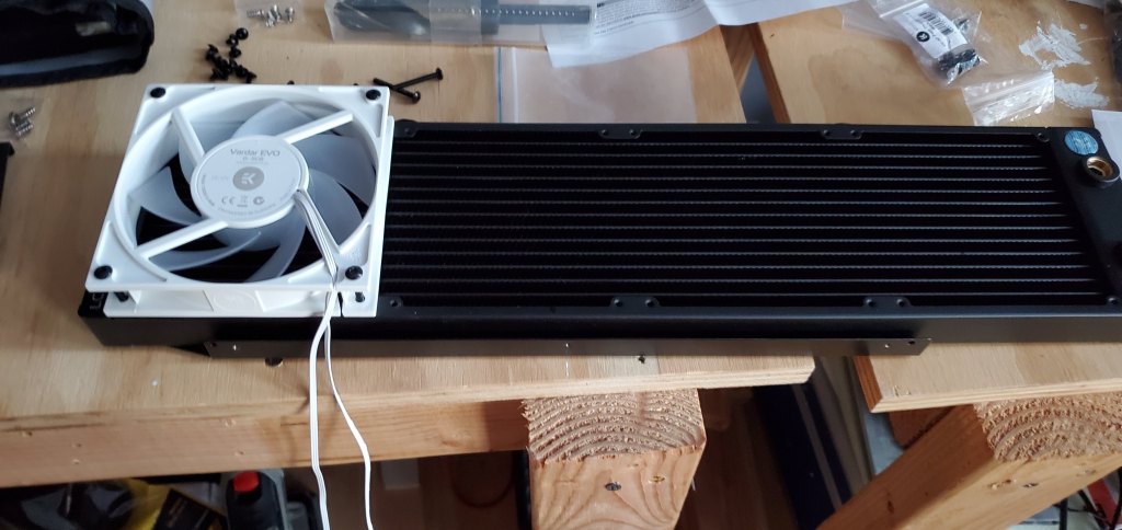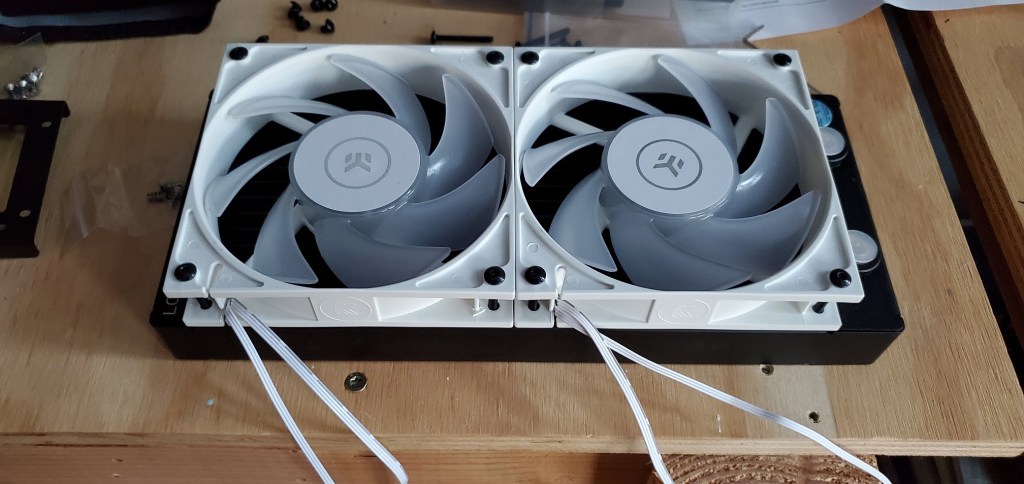 Eagle eyed readers may notice that the small radiator and the big radiator have the fans installed differently. There are two sides to a fan, one with the cage that holds the center stuff which I will call the back (seen on the large radiator) and the other, open side, which I will call the front. Air flows from front to back (hence my naming convention) always. Thus the big radiator is pulling air through the radiator (intake) and the small one is pushing air through the radiator (exhaust). This was intentional and I could’ve run them both the same, but the small radiator is going near the bottom of my case. Yes, hot air rises, but more importantly dust settles, so I wanted to exhaust air here instead of trying to pull more air into the case (I already have six fans pulling air into the case, I have enough airflow as it is!) mostly because of the dust issue.