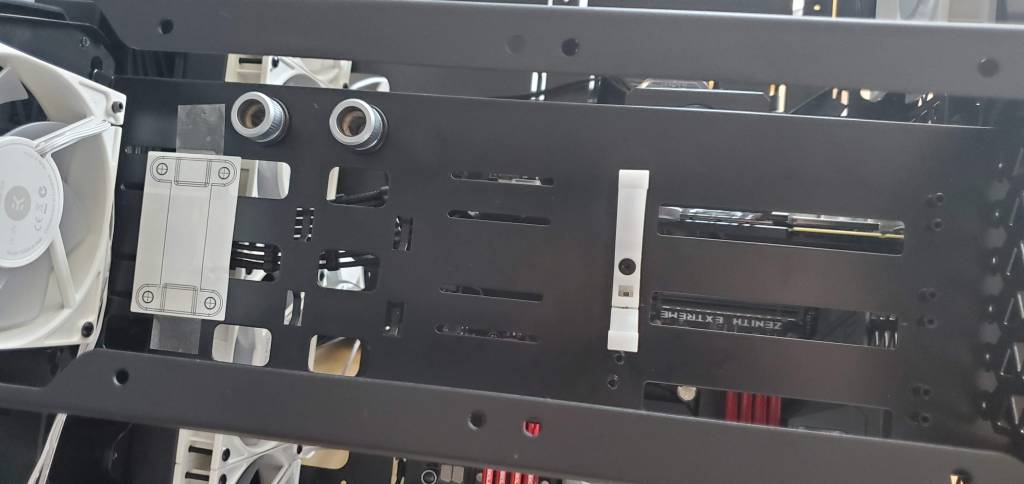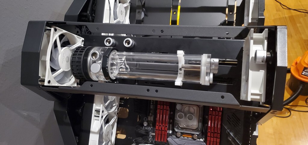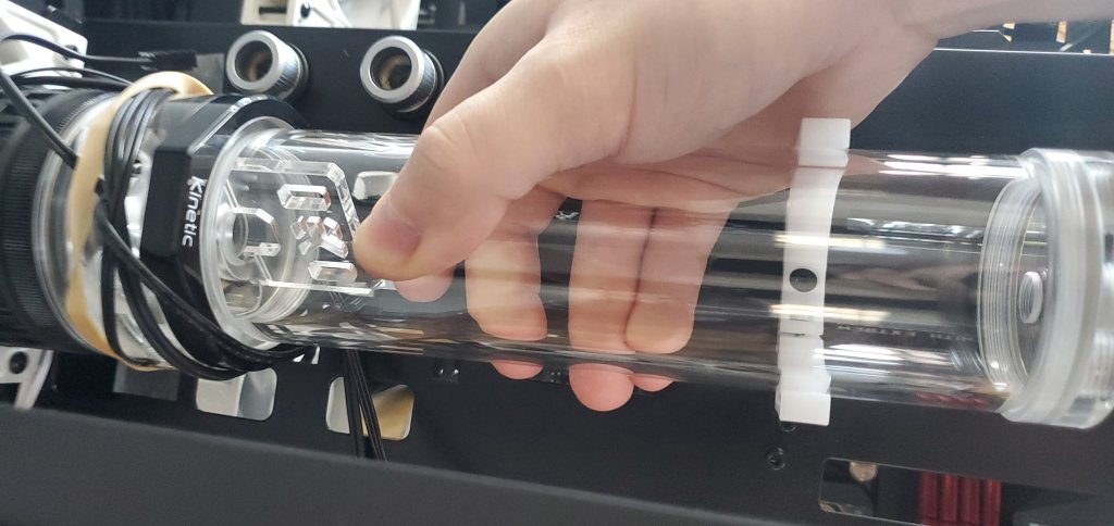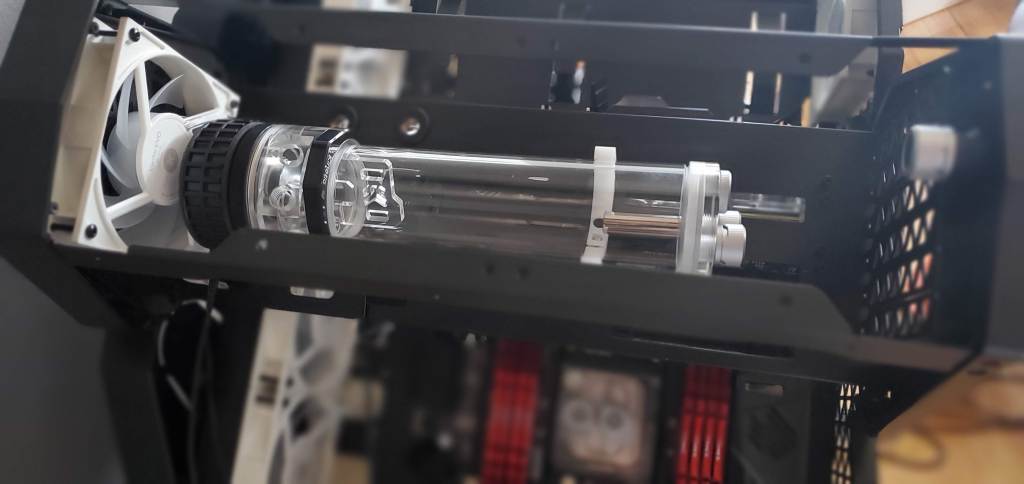 The length of the tube (where the extra liquid is stored) is so long I was worried that just bracing it using the pump bracket would cause problems. For example if I moved my computer and the pump flexed it could crack the acrylic tube, which would obviously make a huge mess. To solve that problem I repurposed that white bracket, it’s technically designed to just hold extra tubes since the more liquid in the loop, the higher the heat capacity and the more stable the temps. Thankfully it worked out perfectly here for my purposes. I had to mount the bracket to one of the risers for the pci holder, but you can’t really see it and it makes the bracket look almost like it’s floating. In the end it’s good peace of mind, but it also doesn’t look bad.