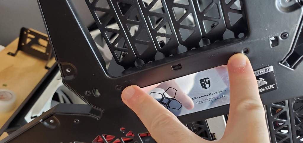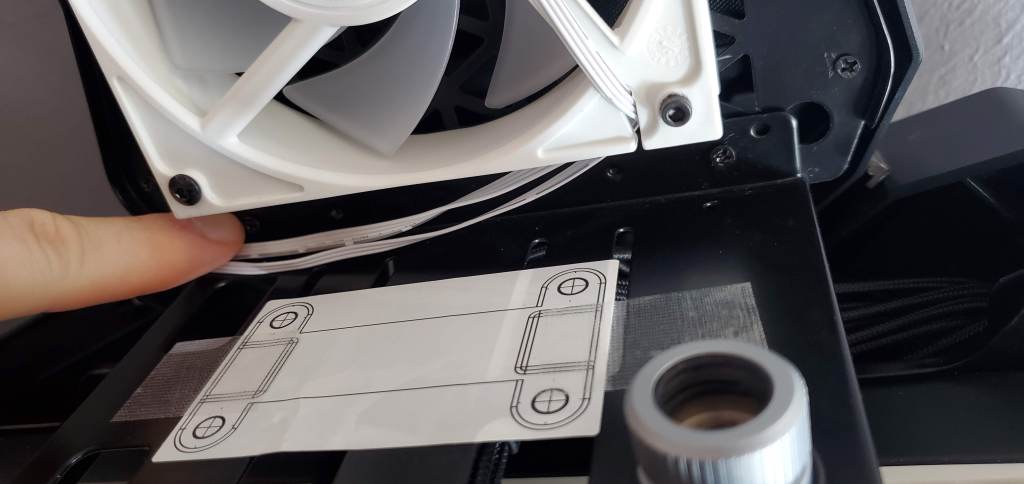 Which of course means we can deal with the mess of wires now. Or at least start planning that far. Now technically the wires came last, so maybe we should start from the beginning. With the radiators in place, the fans set, the cables run (at least on the mostly visible side) and the water blocks placed on the graphics card and CPU, I had only one more piece to place before I could run the tubing. That would be the pump, which I have yet to show a photo of, but I’ve pointed out where it’s going, where the white u shaped bracket is placed now (below).