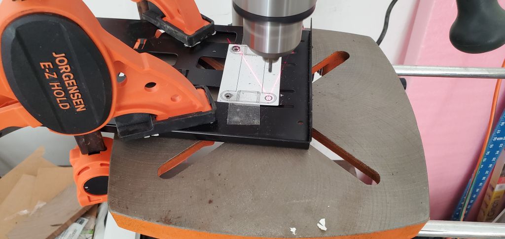 Now the problem became how to make the cut. Embarrassingly, I didn’t have metal bits that small small so I wasn’t sure how to make this cut. I settled on using a masson bit and the drill press. Failed attempts would include, dremel and drill. Luckily I had the drill press (it’s been a great purchase I got an amazing deal on). So I clamped the part down, put the bit into the drill, and cut the holes. As usual, hearing protection, eye protection, and foot protection are all required. You may notice the bit is very short, I placed it pretty far into the chuck to keep it from walking after the first cut I made the bit tried to walk. Walking means exactly what it sounds like, it starts to move away from the hole you want to cut. Reducing the length of the bit and increasing the speed fixed the problem. Remember, when cutting sheet metal, use a metal file to remove the burs or you get something very stabby.