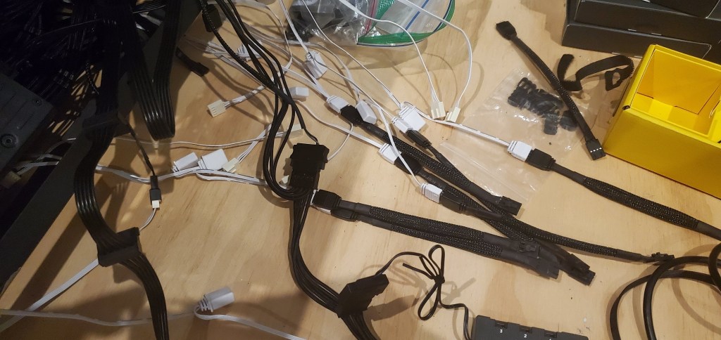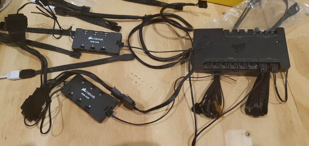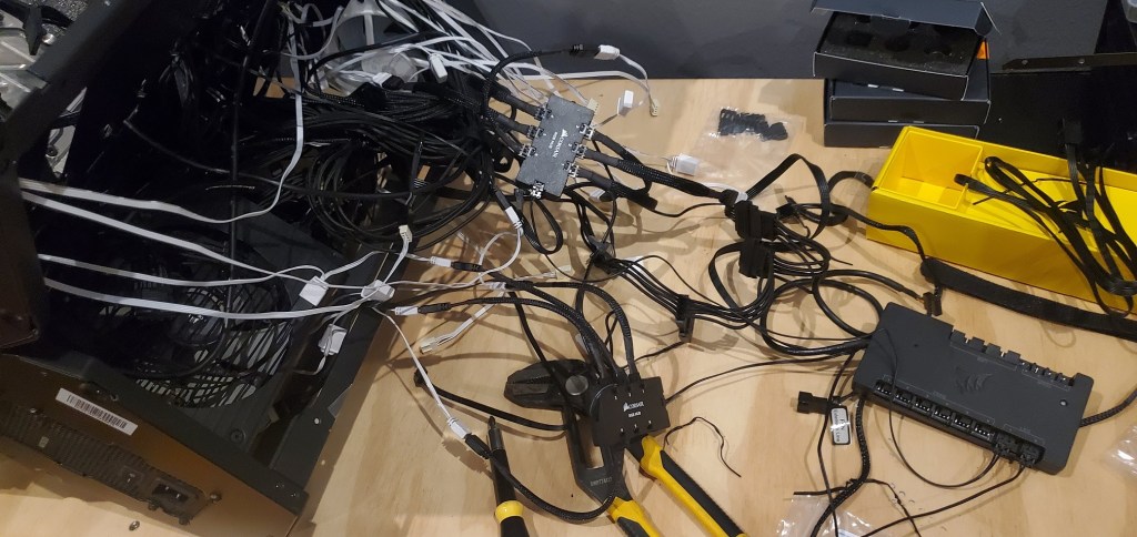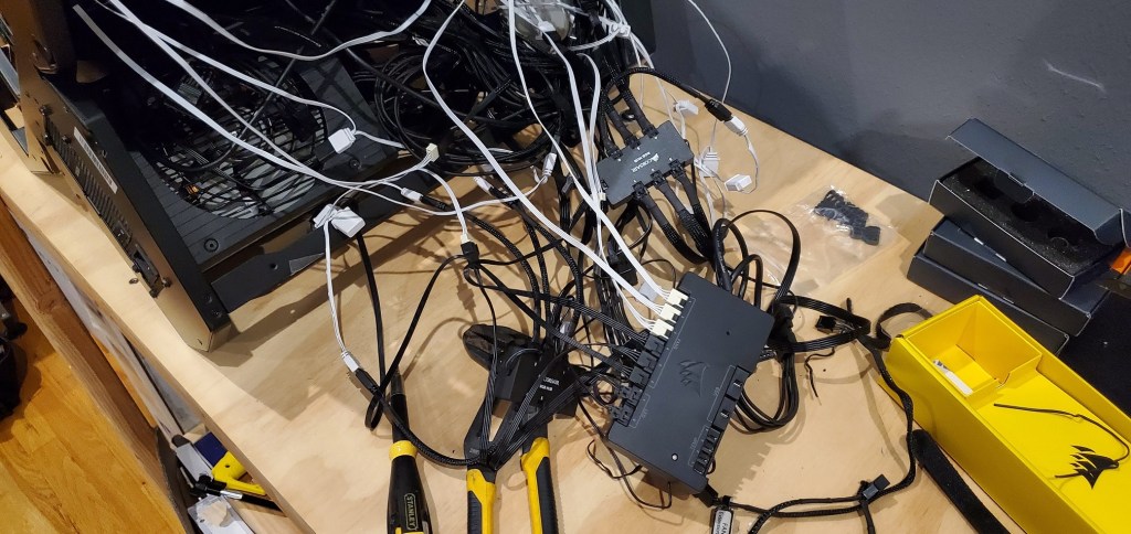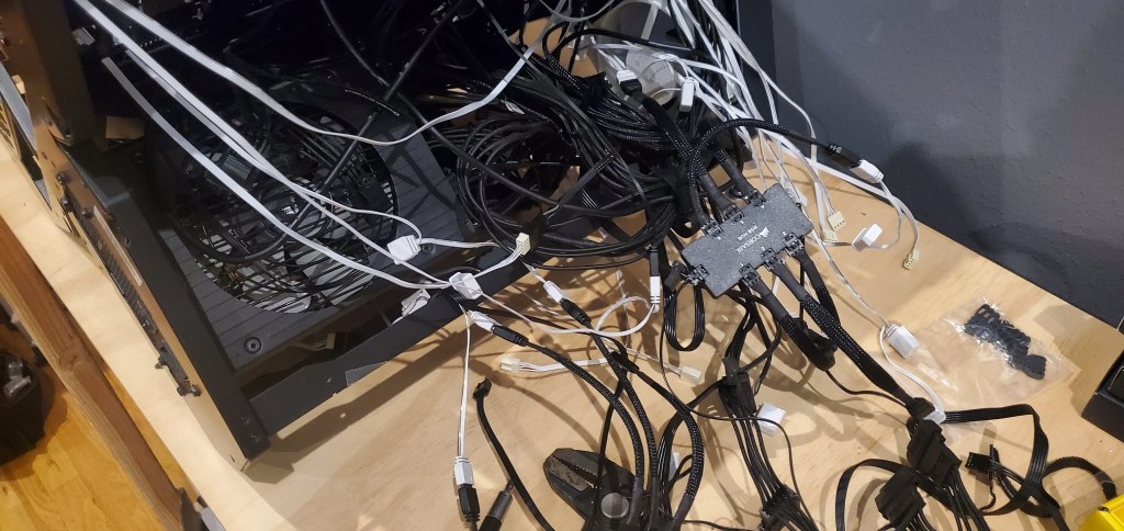 Computers have a lot of cables. It’s frustrating because they need to go somewhere, but one of the downsides to the case I have is that there are very few places to tuck those wires away. Basically it’s a hot mess and it needs to be dealt with, but there is good news! I’ve been avoiding dealing with this issue because I didn’t have the adapters I needed to wire the fans into the corsair icue hardware (I mentioned this yesterday). Of course the adaptors were misdelivered so I was disappointed because I really want to finish this build and I need to get those fans wired in!