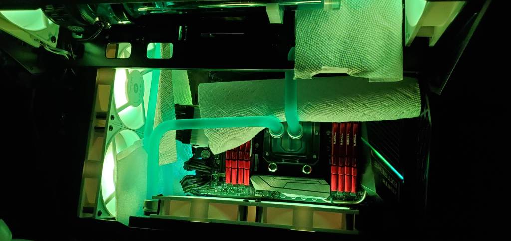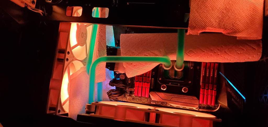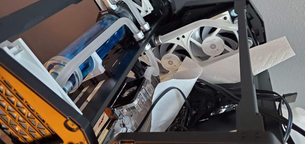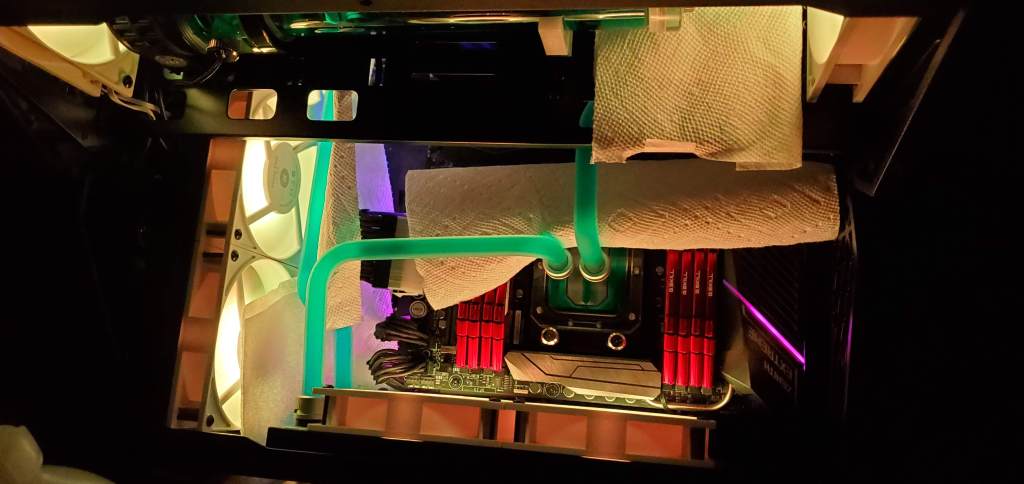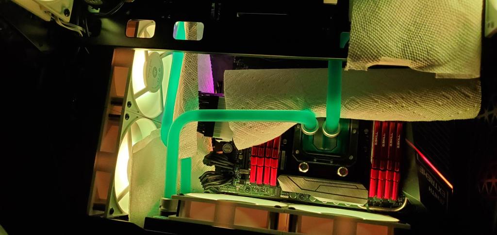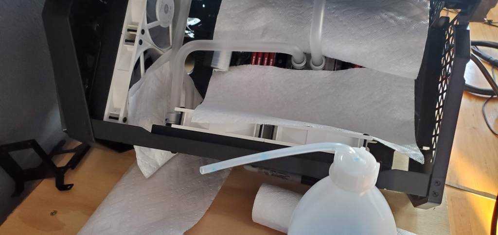 Now as I mentioned I’m an anxious person, so even though I leak tested the loop already, I threw down some paper towels just to be on the safe side. I figure it’s better to be over cautious than under 99% of the time and I really don’t have money for a new computer if I screw this up so paper towels seem to be a good failsafe. If you decide to not use a pressure tester this would be the way to check for leaks. Using white paper towels is preferable because the color will show if it does leak. While I had an accidental minor spill (or rather squirt from the fill bottle), everything remained dry otherwise. It was still good piece of mind.