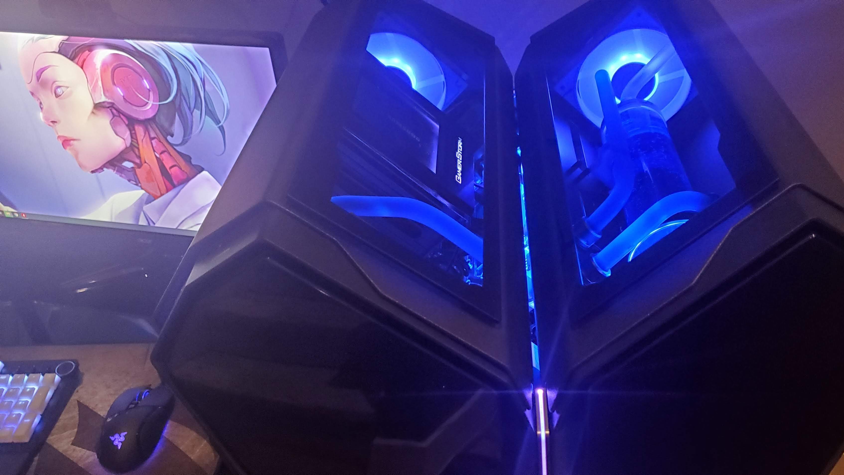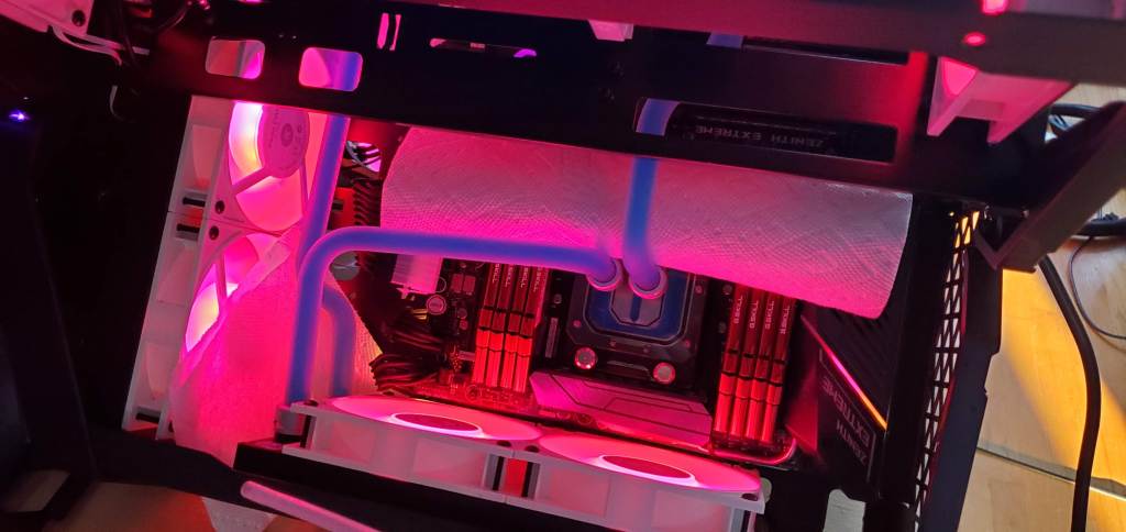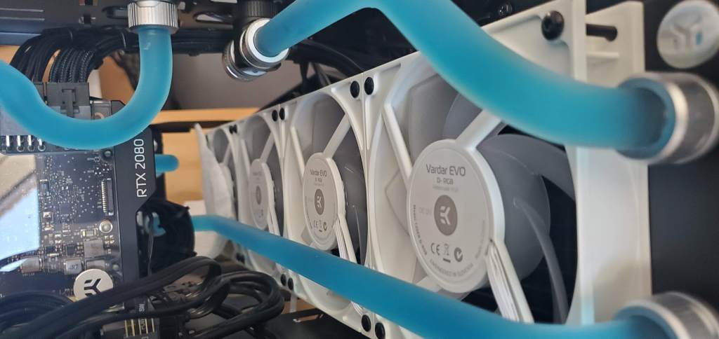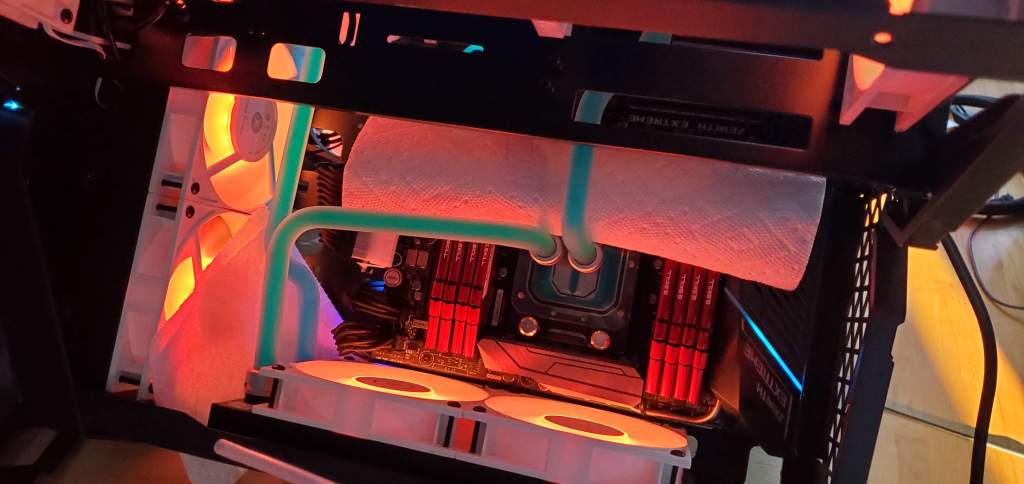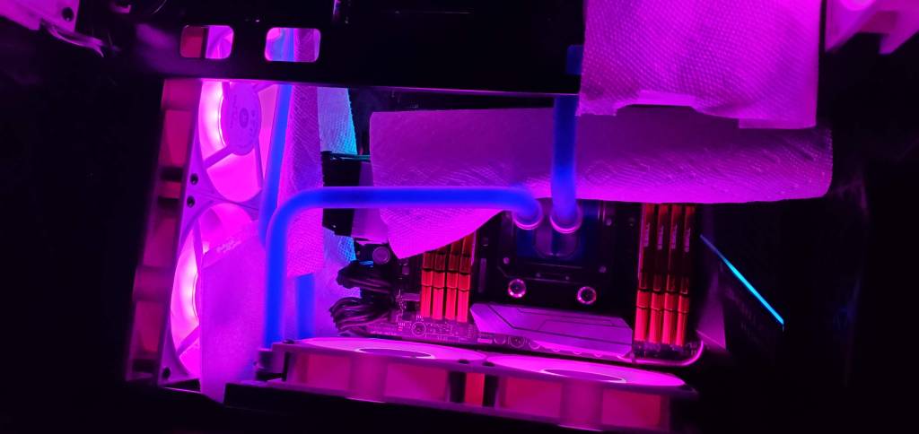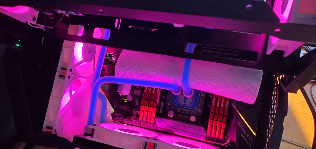 Now that photo is after I turned on the computer and got everything up and running again, but let’s take a look at the photos from the first boot. Oh side note, I used that white jumper once the covers were on to verify that I didn’t bump a line and cause a leak, it also gave me a chance to make sure I didn’t accidentally disconnect one of the LED lights (which thanks to the adaptors to get the fans to play nice with icue, was super easy to do). Thankfully I was being paranoid, no leaks and all the fans came on, so I could plug it in, clean it up and get everything polished nicely. First actual boot changed the color scheme of the fan LED’s to something more dramatic, which I think looked awesome so I grabbed a bunch of photos. Keep in mind this is with the case on and the glass in place. I’m running the quadstellar case from Deepcool, which isn’t being made anymore, but has magnetic glass plates that clip over the exposed openings.