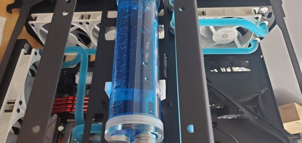 Now we were ready to add in the coolant. I went with a blue coolant since the lines are frosted and it just makes everything feel… cold. I thought it would be a fun little theme to go with the new design. This is where all that planning comes in handy. The fill plug in the back of the computer and the drain plug on the passthrough theoretically mean that I can drain and fill the computer without taking off the covers, a neat trick when I need to drain the loop in ~6 months for the first check. I could go longer in theory, but I’m an anxious person, so that’s not how I do things. After the first check maybe, but definitely not out of the box like that. Below is a shot of the fill process.