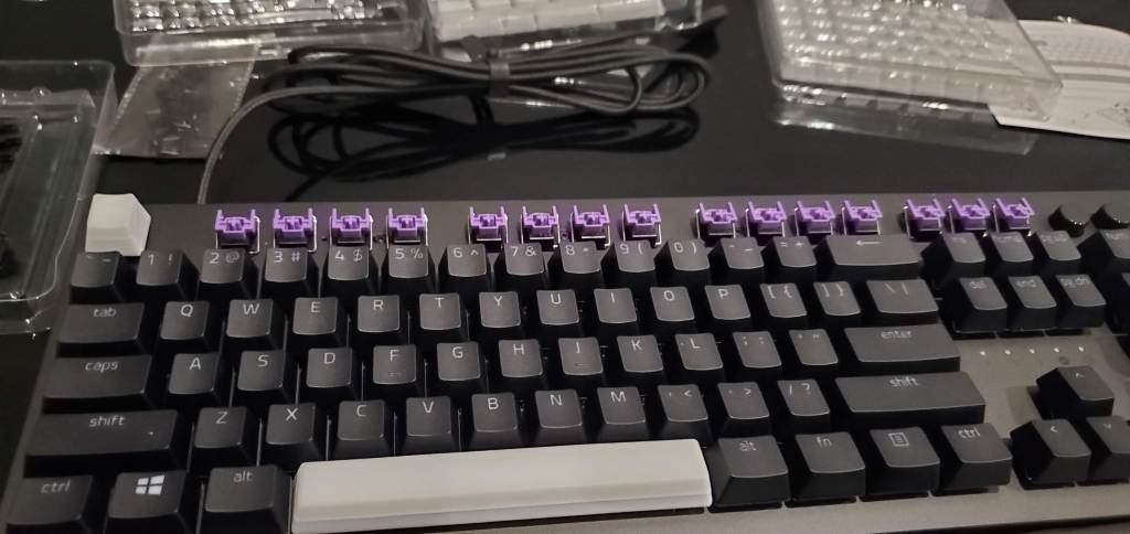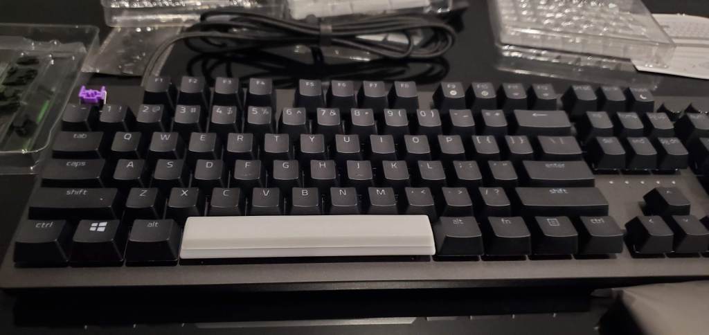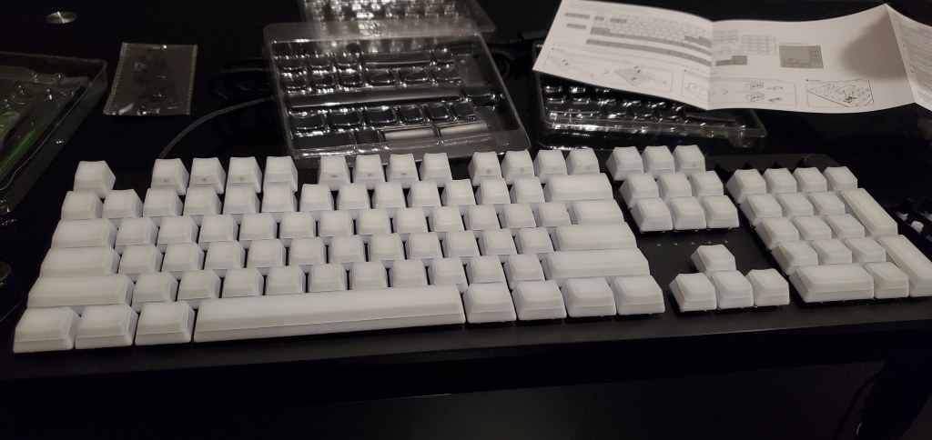 The tricky thing was I couldn’t tell which key was which unless I held it up to the light, but I only needed to check the individual packages to figure out which was next in the order (again they were numbered, I’m just an idiot). The big keys (spacebar, shift, etc) have added braces you need to manually insert then install the key, it was a pain and I you can install them the wrong way if you don’t pay close attention, trust me I did it twice and I was worried I would break a key getting it out. The only thing I’m not particularly fond of is that the keys have a line through them (seen above). Because part of the key is opaque, and the top bit with the hidden lettering is not. Not a huge deal and the keys feel smooth enough that I don’t think I would notice, but you can see it visually which is slightly disappointing. I still wouldn’t change them though, they are awesome looking. The old keys had a weird font to them anyway and I didn’t like it, it felt like a font for a child, which I was glad to be rid of since the new keys don’t have the same font. So like I said without the LED lighting you can’t read them, but once the LEDs are on you can.
