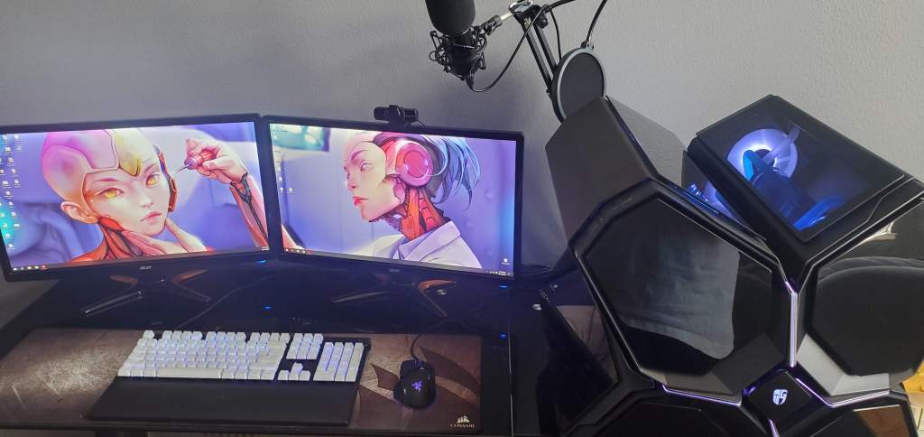 Since it’s all finished, I decided to adjust the colors to a blue that shifts to a white, it just gives everything a “cold” look which I think is… cool. Since we’re done, I can share a quick shot of the full setup. From the photo below you can see the glass panels I’m talking about.