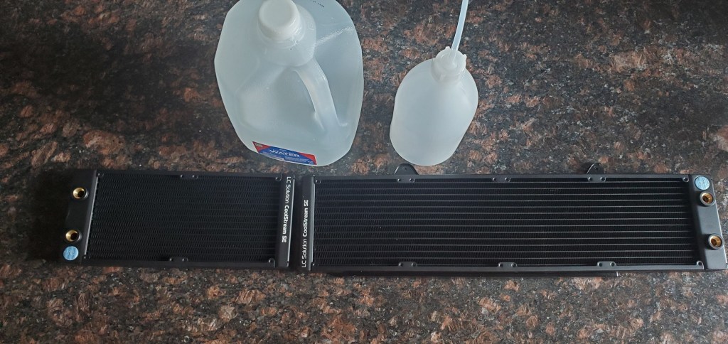 Before installing you’ll want to flush the radiators with distilled water. Don’t use anything abrasive/acidic you just want to rinse out any debris that may be inside from the construction process. I flushed both of these with the full one gallon and I probably should’ve used more, but I wasn’t getting anything out so I called it good. To flush, add water to the radiator (there are two holes, pick one) shake thoroughly or add pressure (if you have compressed air or the such) and flush it out. I’ve seen people build fancy flushing rigs with water pumps and what not, but this seemed to work well for me. Time will tell I guess since they are now in the computer.