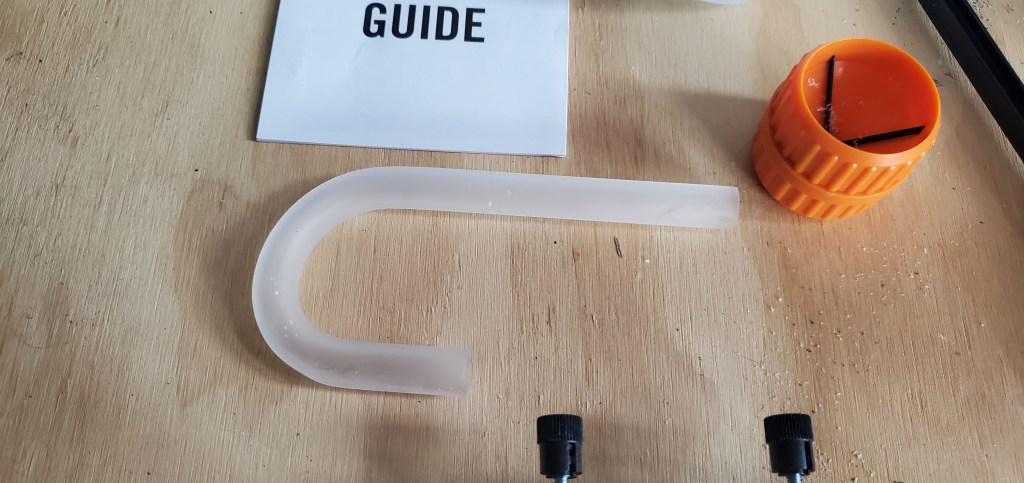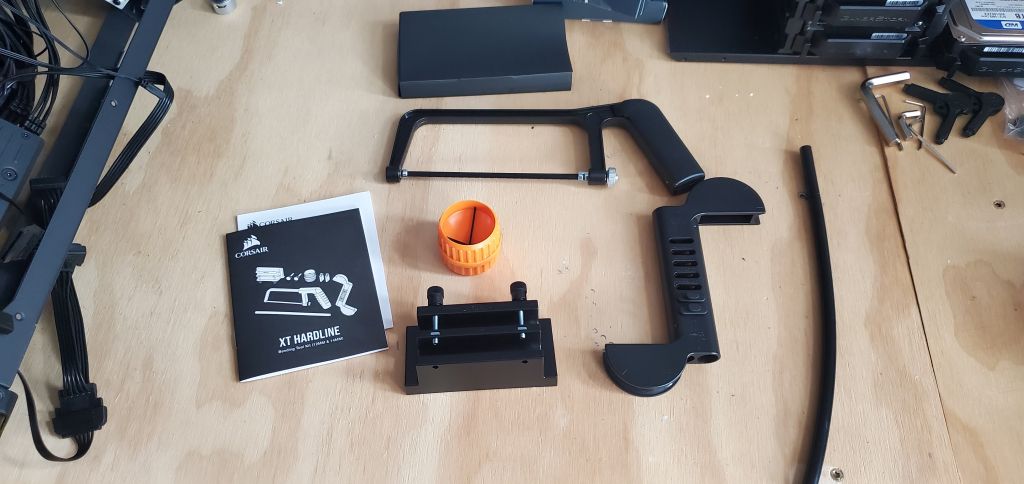 This is going to sound like a corsair commercial (reminder I do not get any sort of compensation from anyone listed here, they don’t even know I exist, I just like the products), but I bought the tubing bending kit from corsair. It comes with a tool that helps you get the correct angle bends you need (like the bend in the tube above). It comes with a core that you insert before bending, the bending tool I just mentioned, the vice (shown above), a saw to cut the tube to length, and a deburr tool to make the inside and outside of the tube smooth. I added more photos of the process below showing the full kit, the tube, the core, the bending tool and a final product.