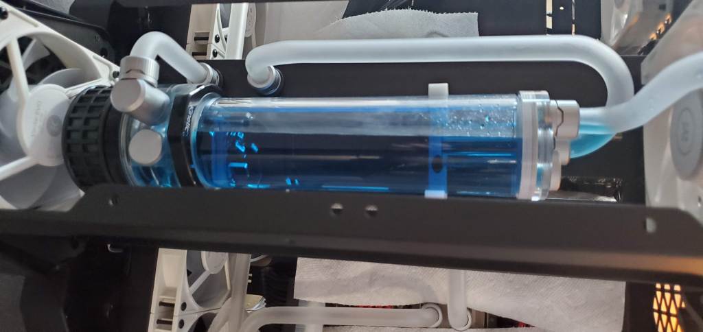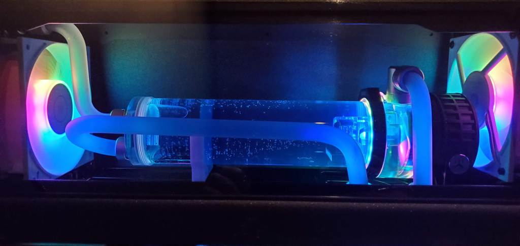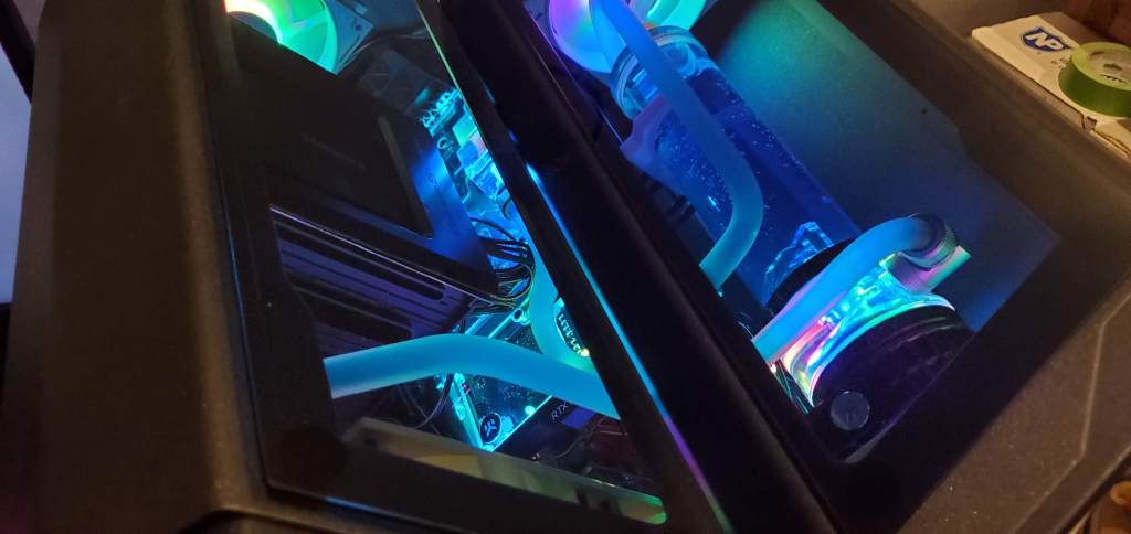 With the case on, it looks pretty good! Keep in mind soft/hard tubing is a matter of preference. I went with hard tubing because it looked better and some of the bends I needed wouldn’t be possible with soft tubing. The main things you need to worry about are the radiator size and tube size, as long as you’re using the same metal across the board you should be good! I used hydro x series xl8 coolant (in blue) for my loop and even with the two radiators and large reservoir, it only took about 1.25 L to fill so less than two 1L bottles.