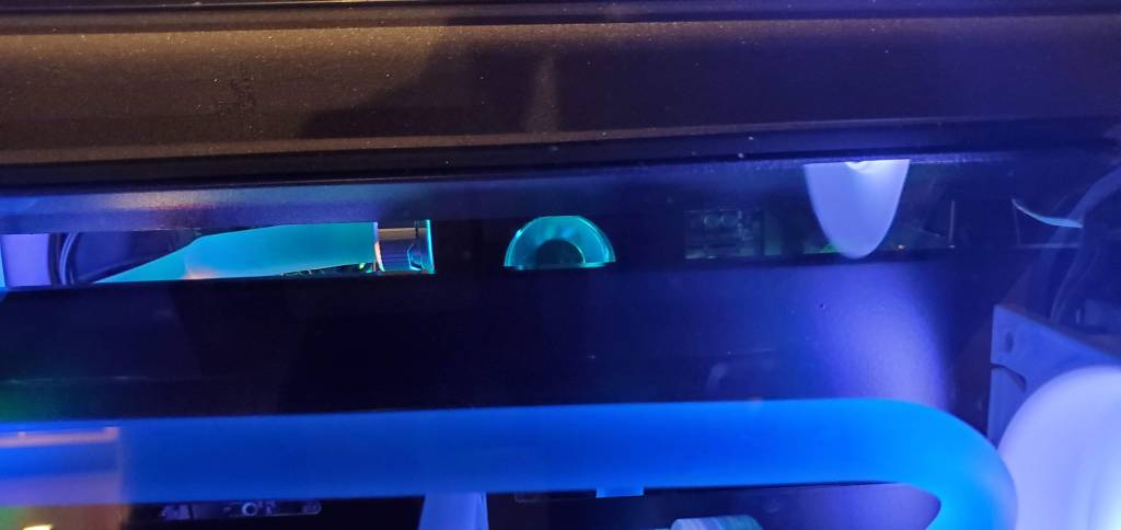 Once the air is mostly out, you need to… jiggle the system. Seriously. I tilted this big ass computer forward, backward, and side to side. You’ll literally hear the air work its way out of the system as you do this it will sound like something broke free and is running through the tubing. I did this a few times, turned off the system, gently dropped the back of it from about an inch off the table to help break surface tension of the bubbles, then turned it on. I repeated this off/on shaking process for a good hour before I noticed most of the air was gone from the graphics card and it stopped making filling noises when I tilted it. We’re not done though, even with most of the air out, there was still a lot of microbubbles, those have to go so leave the system on and walk away. I left mine going for about three hours. Shut it off, shook it, turned it on, shook it some more, then walked away for another two or three hours. At that point no amount of shaking or on/off flipping caused the loop to make any sort of air sloshing noises so I assume I got most/all of the air out of the system at this point and could reassemble.
