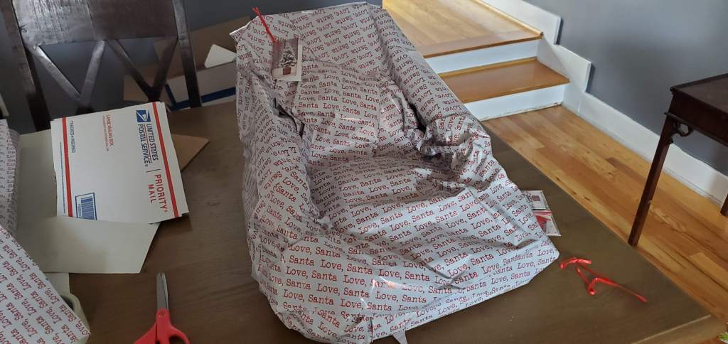 The joke is that the “chair” is obviously too small, so once again I’m playing the hapless idiot. This is more “child size” than adult size, which will make it funny when they get it and even funnier when they open it. The really great part is that I used packing materials to “fluff” the arms with. They are made using some cardboard I cut and rounded and given volume with the packing materials. So when they go to pick it up it really will feel and act like a child sized chair. The pictures don’t really do it justice, but I find it’s hard to get good photos of my gifts. Probably because it’s hard to gauge depth since it’s all the same wrapping paper.