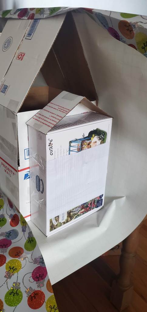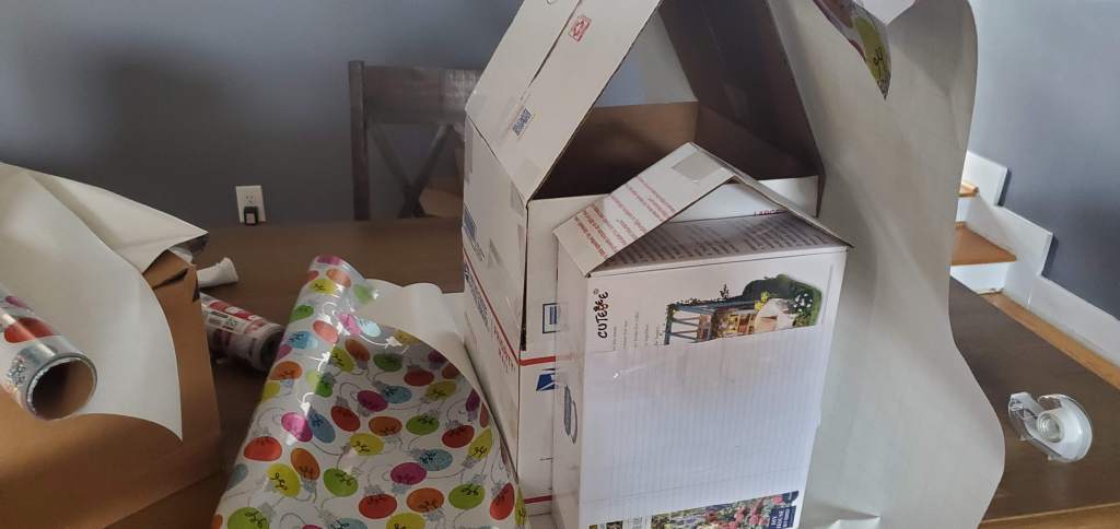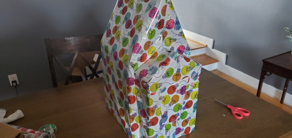 Every year I say that it is about the lines and it really is. You want to create the shape of the thing you want people to see, but don’t get caught up in the details or you’ll never be able to see what they are once you throw wrapping paper on. The basic shape is typically enough and even though I got a little fancy with the front of it, I wanted to give it a very specific look. Unfortunately it looks like a barn or a church and not quite the house I was going for, but it’s enough to throw people off at least and that’s all that really matters.