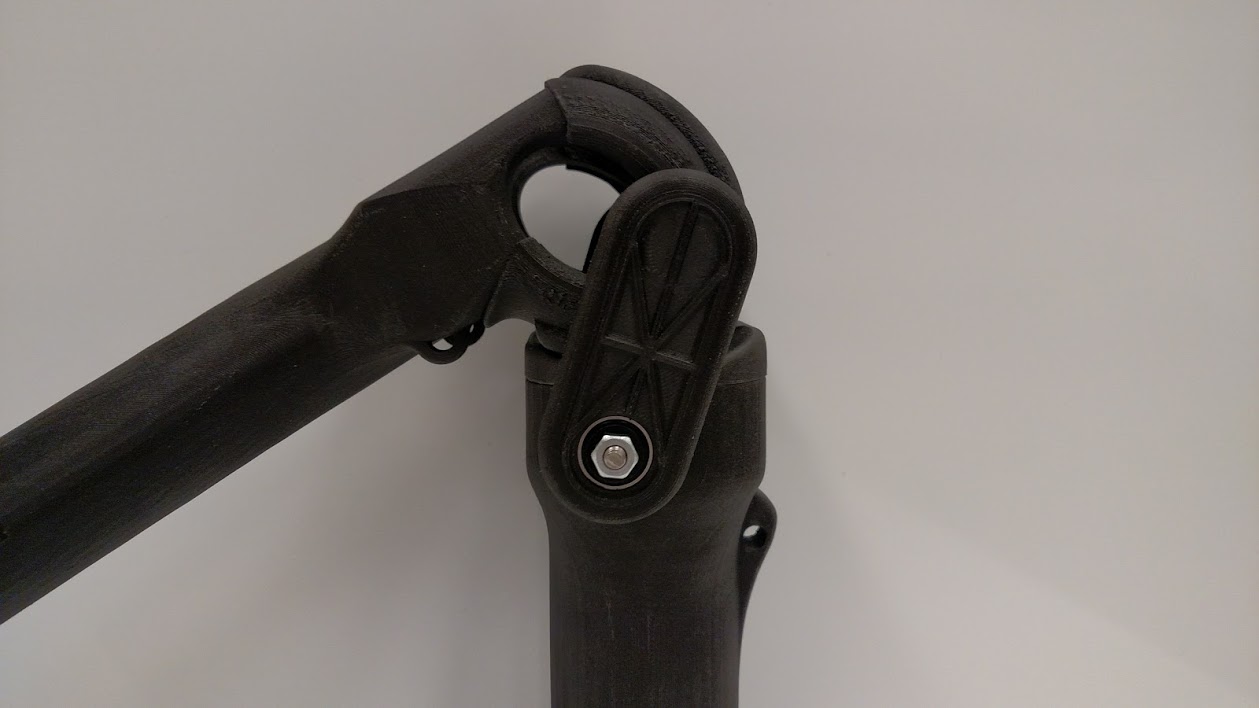 Since I didn’t get to talk about it yesterday either, I should also point out I keep saying I went through three major iterations with the knee, but yesterday I only showed two, the one you see above and the aluminum version, but there was a third! I don’t talk about it because it was very similar to the second iteration, but this was when I convinced my PI to purchase a special 3D printer that would produce very strong (still anisotropic) parts.