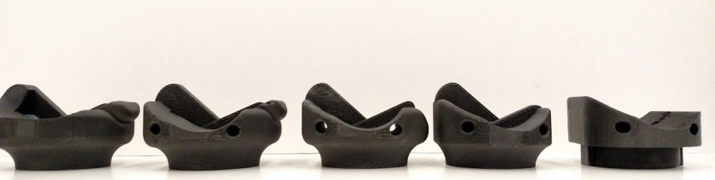 The point being, there were a lot of changes and from discussions with my former PI, the robot is still undergoing changes, mostly to lock certain degrees of freedom so they can study how it behaves using a simplified model and because 3D printed parts have that whole anisotropic behavior about them I just mentioned (it’s a pain). Since yesterday’s post was VERY long, I didn’t get to talk about the path to the final design, but I did hint at it. The image below for example highlights five of the changes to the knee design and in particular I think it’s important to talk about the change from the third (middle) to the fourth (counting from the left), because while they look similar, you’ll notice the “tail” that exists in that version and the “final” which is furthest left.