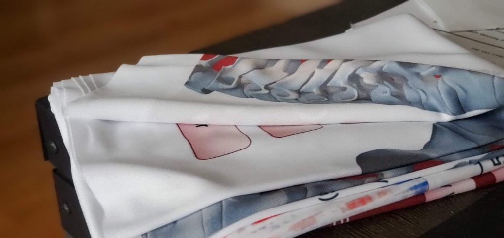 Normally in the past, when I print posters like this, even the most “fabric” of fabric materials feels almost like thin plastic or tarp even. It’s hard to describe if you’ve never got a plastic “fabric” poster before, but they are definitely not, “turn into a blanket” material. The fabric, because it’s real fabric, has the fabric texture to it and is visible on the poster itself. You can probably see it in the photo if you squint really hard, the fabric has a tight knit to it, but it’s not paper so it’s noticeable. To me, that’s a plus, it gives the poster a texture to it, but if that’s not your thing or you think it looks bad then by all means poster tube away! The fabric isn’t super thick which is good for traveling, you can see in the photo I have it lightly folded and it doesn’t take up a whole lot of space even like that. Since it’s fabric though it’s pretty sturdy so I don’t have to worry about tearing it.
